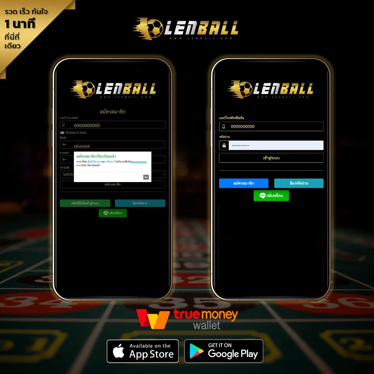 Lenball ให้สมัคร UFABET เข้าสู่ระบบได้แบบฟรี ๆ ไม่ต้องฝากเงินก่อน เพียงใส่เพียงเบอร์ ทรูมันนี่ วอลเล็ต เท่านั้น ระบบจะแสดง ชื่อ-นามสกุล ให้อัตโนมัติ ไม่ต้องมีบัญชีธนาคาร